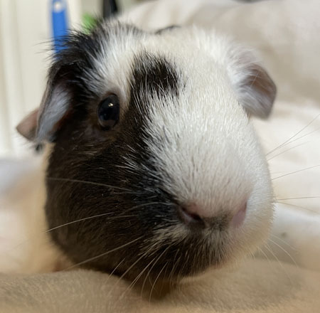 Osgood is a member of the LA400, and is ready to find her forever home. She's s very sweet girl, the kind who enjoys snuggling in your fleece jacket, sitting in your lap, and hanging out while you read a book, especially if you give her head rubs. When she feels safe, she'll relax and enjoy floor time, even popcorn. She feels safer with something over her head, a person she trusts, or a brave guinea pig friend. However, she is still very shy and skittish. She startles very easily at unfamiliar and sudden noises that are normal to us, like a video or music starting to play, or the ringtone on your phone. When this happens she sometimes panics and bolts, so it's very important to make sure that she doesn't fly off a high surface or try to jump out of the cage! She also sometimes appears to be nervous and out of sorts for reasons that are not obvious to us, and may chubble or behave a little oddly with other guinea pigs. For these reasons we recommend a quiet home without children under 12, and preferably an experienced and patient person.
